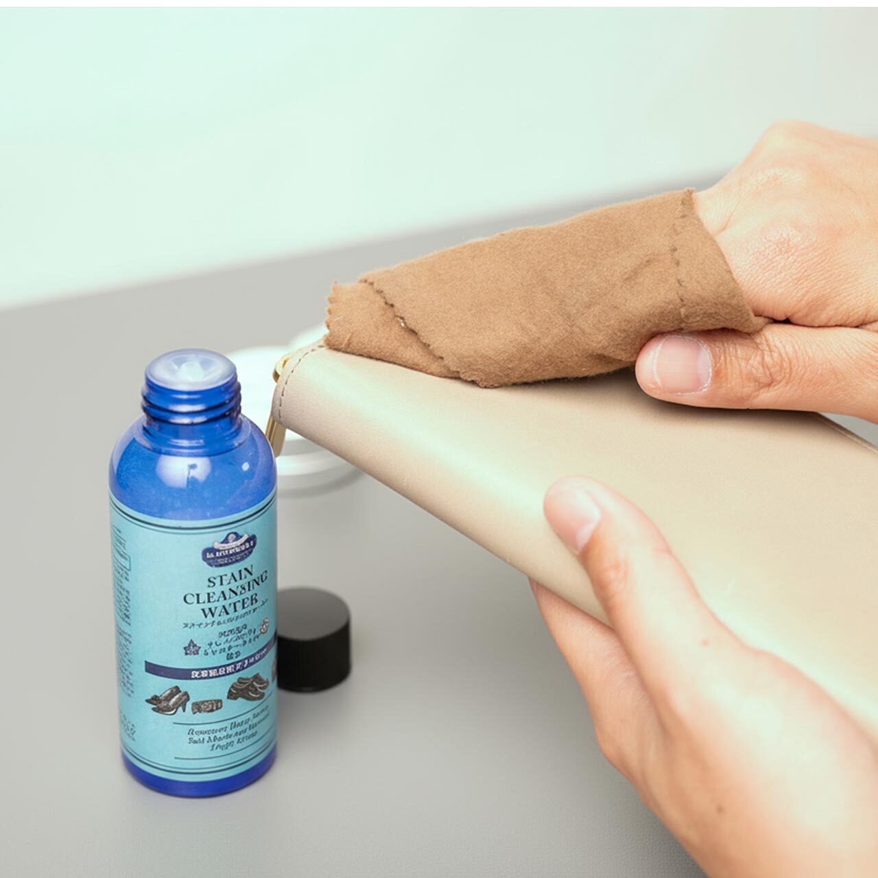 次に、クロスにクレンジングウォーターを適量とり、円を描くようにやさしく拭きましょう。ゴシゴシ擦らず、“撫でる”イメージでケアすると、革に傷がつきにくく安心です。