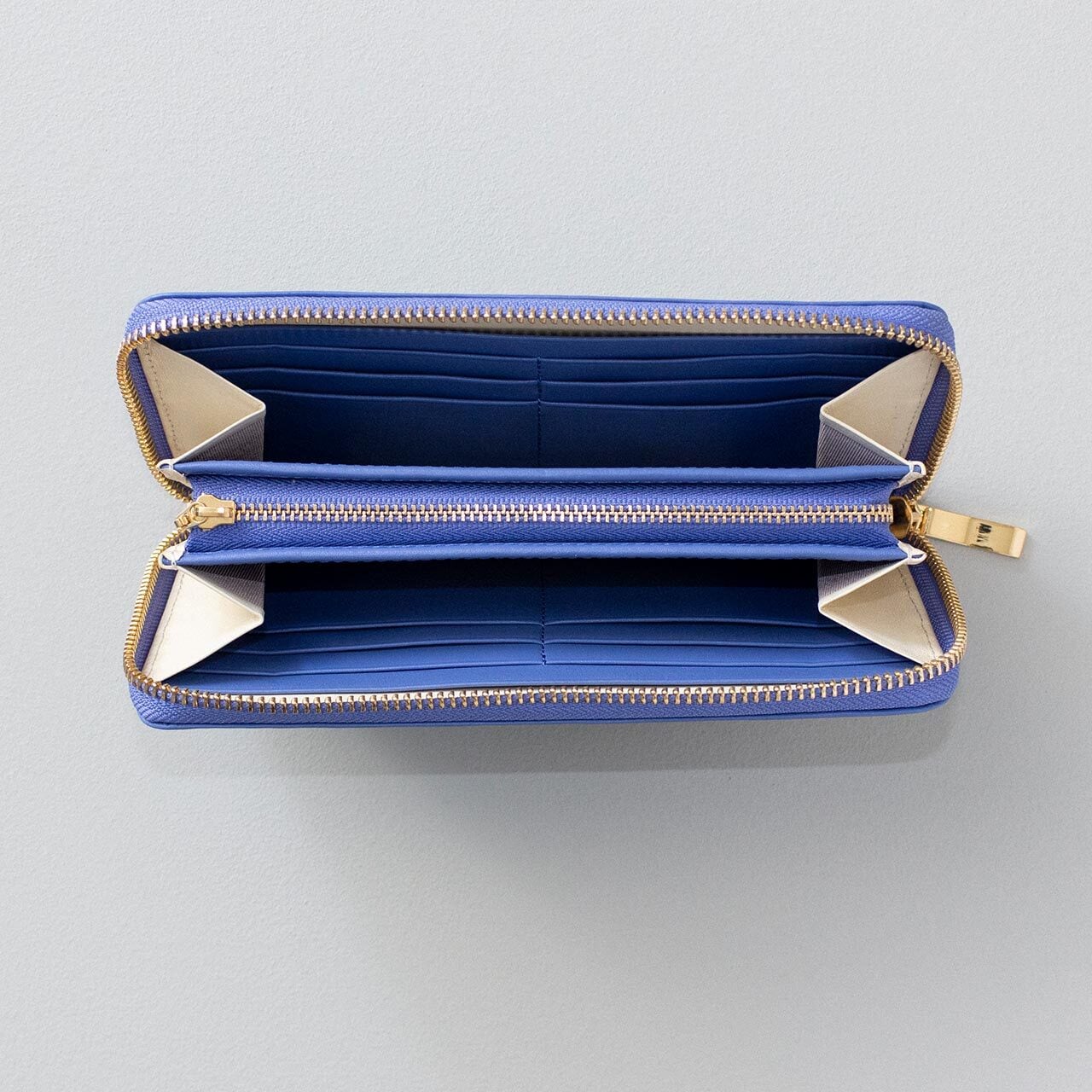 ・高級感のあるゴールドの引き手がレザーの質感を引き立てます。バッグから取り出したときの印象も上品です。完全に閉まるラウンドファスナーのため、中身を落とす心配もありません。